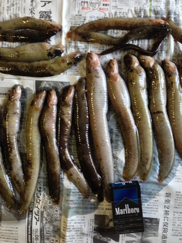 赤く塗られたブラクリの重りをそっと岩の間の穴に落とす。と間もなく強い引き。カサゴ(地元ではアラカブ)の大物かと期待して竿を上げると、その先にはドジョウのような姿の大きなギンポ(写真の魚)が。その後も、見たこともないような20センチ以上ある大きなものも含めて、ギンポが入れ食い状態に。ということで、写真にあるように、調子に乗ってたくさん釣り上げてしまった。